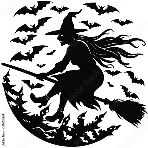 Fototapeta premium Black witch flying on broomstick with bats silhouette