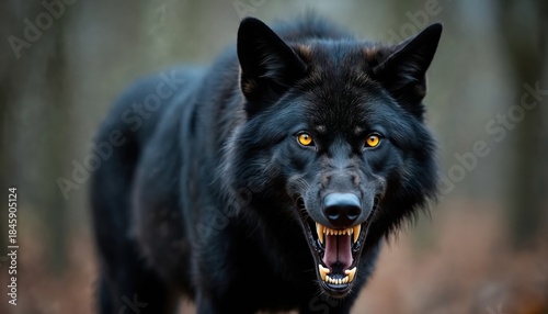 Obraz premium Black wolf bares sharp fangs and teeth, eyes glow yellow in forest. Fierce...