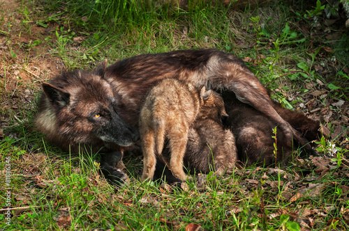 Fototapeta premium Black Wolf (Canis lupus) Feeds Her Pups