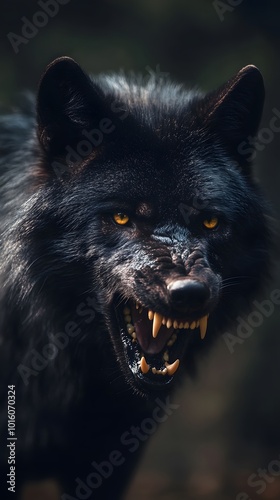 Naklejka premium Black Wolf Growling with Sharp Teeth and Yellow Eyes