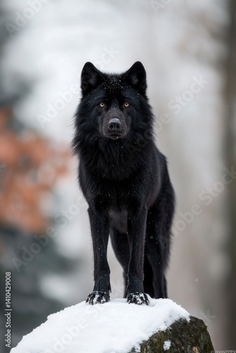 © Outkast, Naklejka premium Black wolf standing on snowy rock in winter forest, looking directly at camera