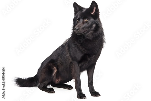 © Isra, Obraz premium Black Wolfdog Poses Majestically, Sitting Calmly Outdoors