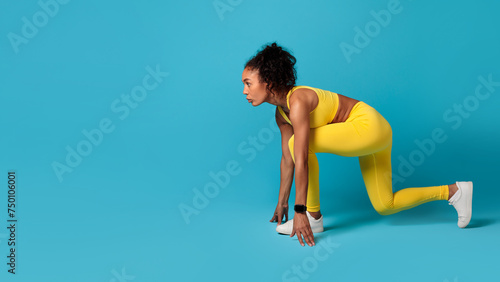 © Prostock-studio, Obraz premium black woman confidently posing in crouch position on blue background