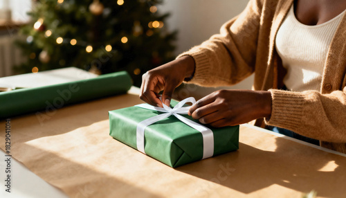 © Anna, Naklejka premium Black woman's hands wrapping a Christmas gift with green paper and a white ribbon. Holiday preparation and celebration concept