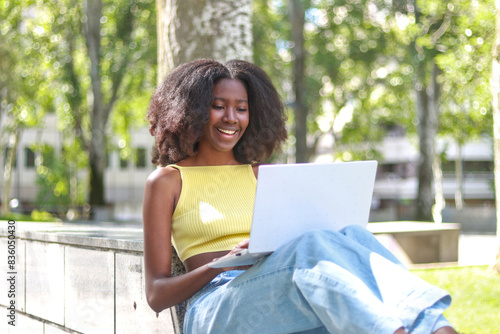 Obraz premium Black woman with afro hair smiling using a laptop computer outdoors, lying...