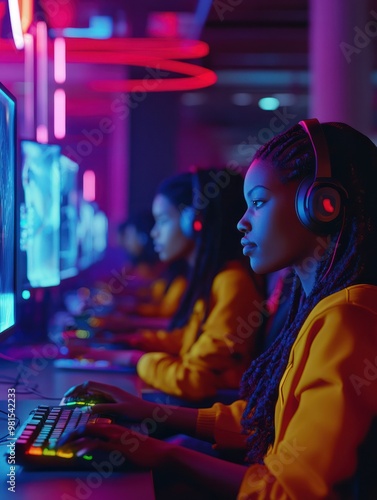 © Johannes, Fototapeta premium Black women in bright clothes play e-sports in a futuristic cyber cafe illuminated by neon lights, showing focus and immersion in their gameplay.