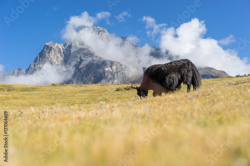 © skazzjy, Fototapeta premium Black yak in front of stone mountain, Everest region, Nepal