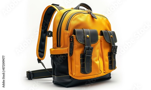 © Emile, Fototapeta premium black, yellow carry on backpack for travel isolated on white background children s school satchel bagpack colored briefcase for teens.stock photo