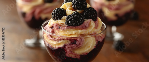 Fototapeta premium blackberry and lemon curd fool in a wine glass,