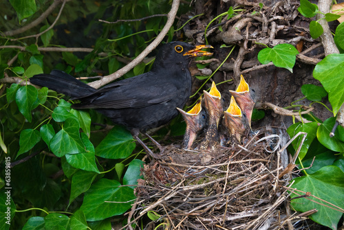 © YK, Obraz premium Blackbird nest male feeding chicks