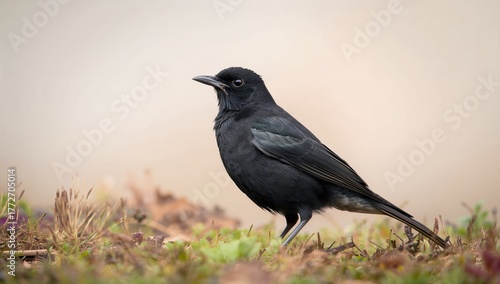 © GenZGraphics, Fototapeta premium Blackbird standing in full profile against a softly blurred neutral backdrop, showcasing its elegance and focus