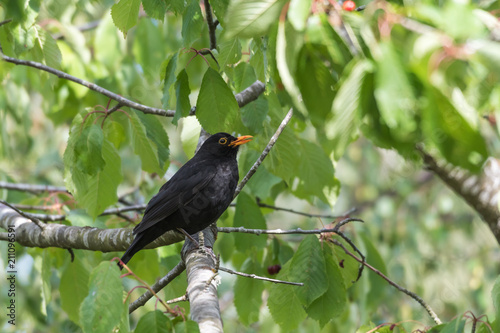 © olandsfokus, Obraz premium Blackbird stealing cherries in a tree