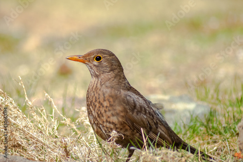 © Margit Kluthke, Obraz premium Blackbird, Turdus merula, in the home garden. focus on foreground