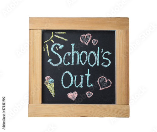 Fototapeta premium Blackboard with words School's Out and pictures isolated on white. Summer holidays