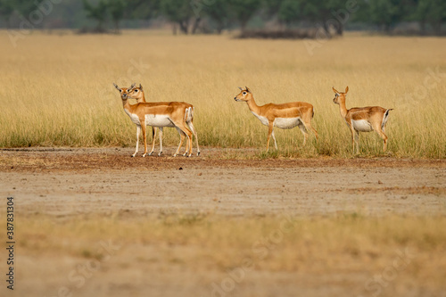 © Sourabh, Fototapeta premium blackbuck or antilope cervicapra or indian antelope group in open field and grassland of tal chhapar sanctuary rajasthan india