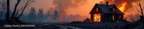 © Busban, Fototapeta premium Blackened landscape, twisted metal, remnants of a home consumed by flames , burnt building, devastation
