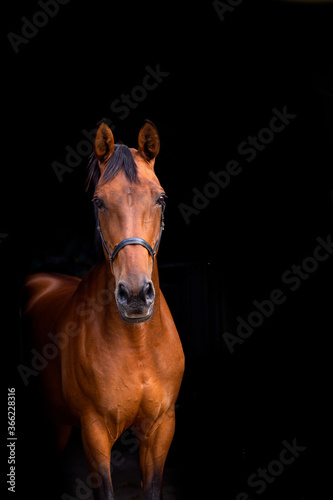 Obraz premium Blackphoto portrait of a brown horse inside, horse looking into camera, brown horses, mare, cross country, dressage, showjumping