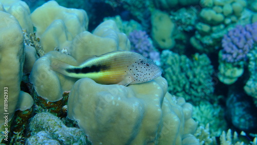 Fototapeta premium Blackside hawkfish (Paracirrhites forsteri) undersea, Red Sea, Egypt, Sharm...