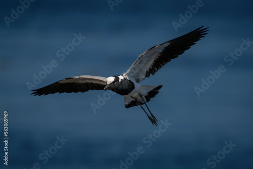 © Nick Dale, Fototapeta premium Blacksmith lapwing glides over river in sunshine