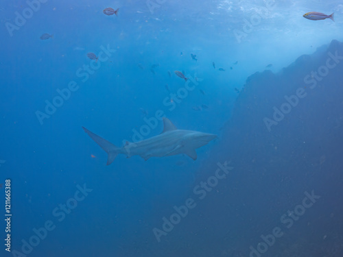 Fototapeta premium 大きく美しいカマストガリザメ(メジロザメ科)他。 英名学名:Blacktip shark, Carcharhinus limbatus 静岡県伊豆半島賀茂郡南伊豆町中木ヒリゾ浜2024年