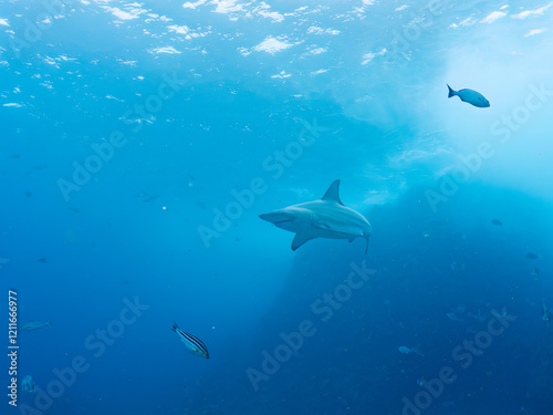 Fototapeta premium 大きく美しいカマストガリザメ(メジロザメ科)他。 英名学名:Blacktip shark, Carcharhinus limbatus 静岡県伊豆半島賀茂郡南伊豆町中木ヒリゾ浜2024年