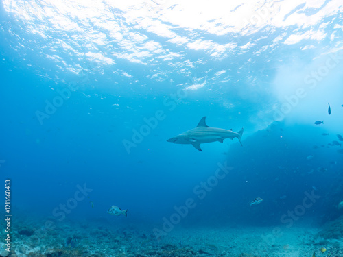 Obraz premium 大きく美しいカマストガリザメ(メジロザメ科)他。 英名学名:Blacktip shark, Carcharhinus limbatus 静岡県伊豆半島賀茂郡南伊豆町中木ヒリゾ浜2024年