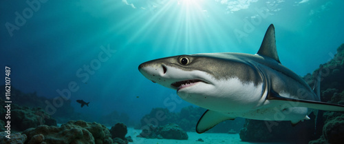 Fototapeta premium Blacktip shark gliding through serene underwater landscape at dawn, harmony