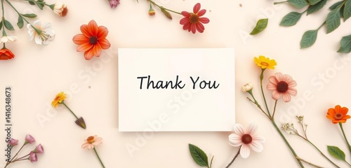 Obraz premium Blank beige square thank you card mockup with botanical illustrations, flat lay, copy space, copy space, texture