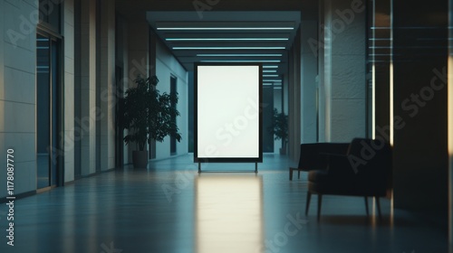 © ImageKing, Fototapeta premium Blank billboard display along wall in office hallway. Empty lobby interior with white LCD screen floor stand for advertising. Vertical ads banner in interior, realistic 3d vector mock up