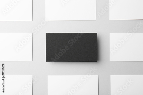 Obraz premium Blank black and white business cards on light background, flat lay. Mockup for design