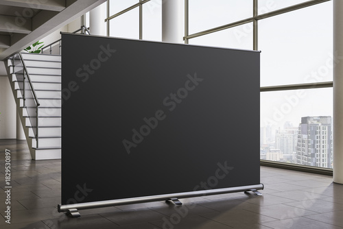 © Who is Danny, Obraz premium Blank black banner display in modern office hallway with city view through large windows and stairway in background. 3D Rendering