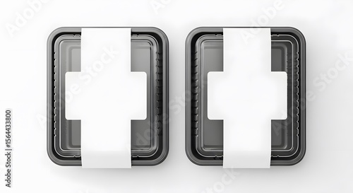© Sherna, Fototapeta premium Blank Black Square Food Containers with Labels Packaging Mockup