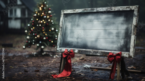 © Jioo7, Fototapeta premium Blank blackboard with red ribbon and Christmas tree in the background