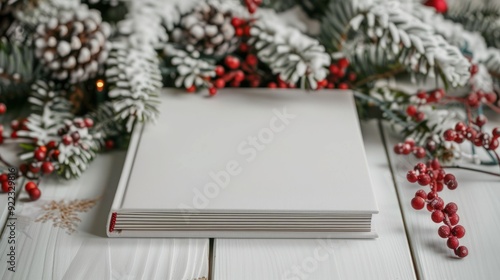 Fototapeta premium Blank book placed on white wooden table surrounded by pine branches and red berries during winter