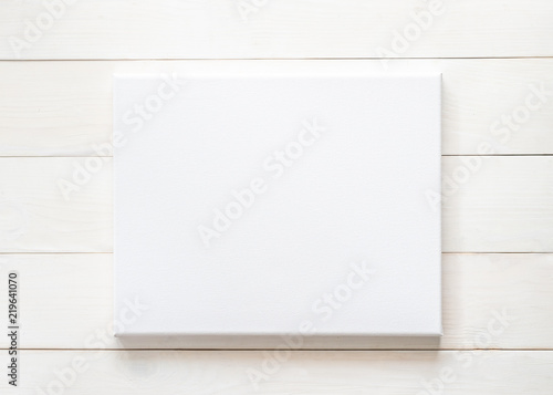 © Chinnapong, Naklejka premium Blank canvas frame mockup rectangular size on white wood wall for arts painting and photo hanging interior decoration