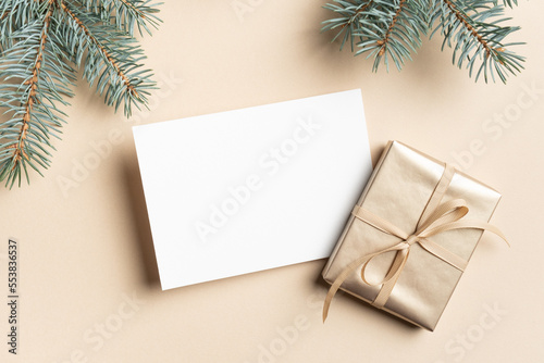Obraz premium Blank card mockup with christmas gift box and fir tree