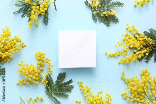 Fototapeta premium Blank card with beautiful yellow mimosa flowers on blue background