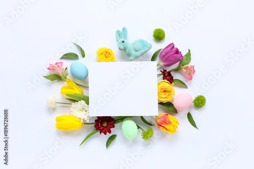 Fototapeta premium Blank card with toy bunny, Easter eggs and flowers on white background