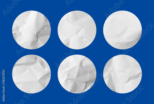 Naklejka premium blank crumpled paper mockup design. Realistic round stickers in wrinkled...