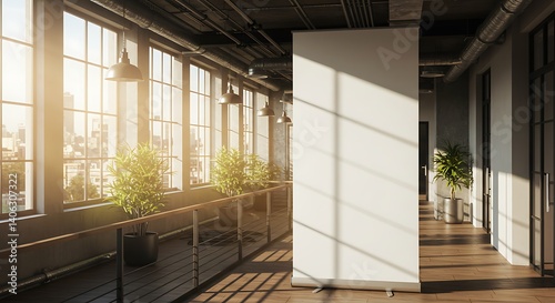 © Feb, Obraz premium Blank Display Stand in Bright Hallway with City View