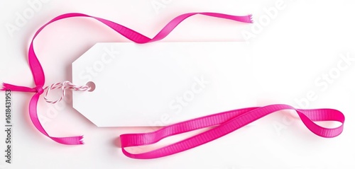 Obraz premium Blank gift tag with pink striped ribbon on white background, top view, texture, white background