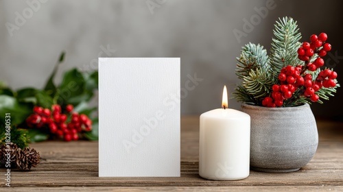 © Nataliia_Trushchenko, Obraz premium Blank greeting card mock up with white space beside a lit candle and festive greenery, creating a warm holiday atmosphere for seasonal celebrations and personal messages