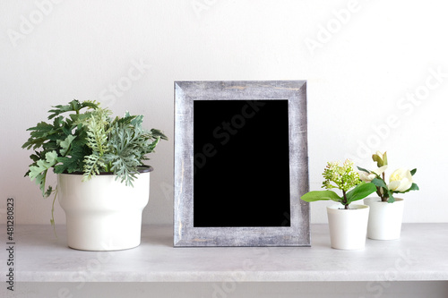 Fototapeta premium Blank grey vintage wooden frame on table and white wall banckground , banner,...