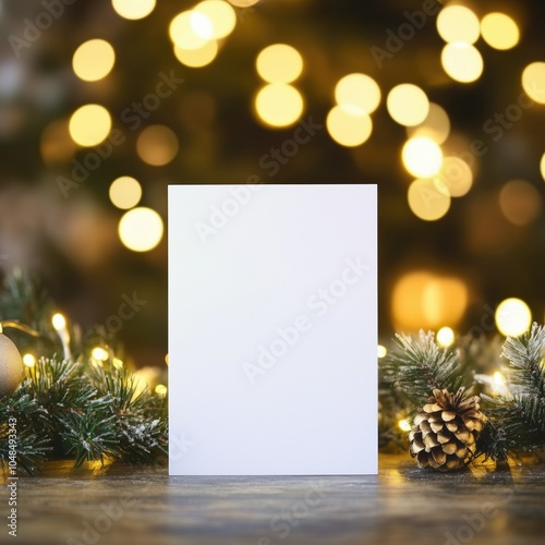 © Alena, Fototapeta premium Blank invitation mockup, festive bokeh background of fairy lights. Сard template with empty space for text or branding. Christmas, New Year, winter holidays, wedding, vertical card designs mockup