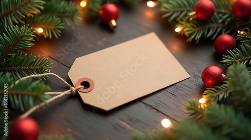 © leon, Obraz premium Blank kraft gift tag on dark wooden table with Christmas fir branches lights and red baubles