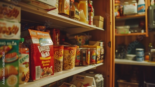 © Nehtott, Naklejka premium Blank Label Cereal Box: A cereal box with no label in a kitchen pantry.