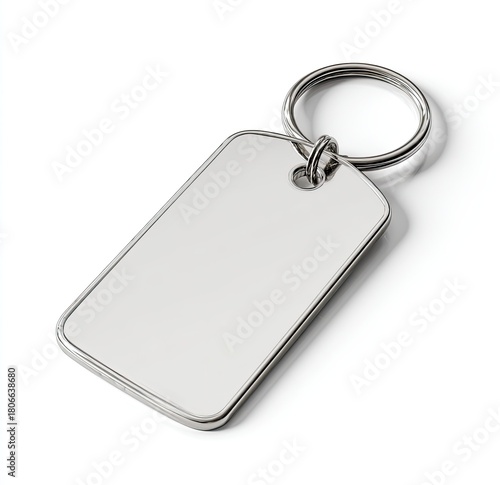 © Kiki, Fototapeta premium Blank, metal key tag, angled view. Shiny, rectangular, with a keyring