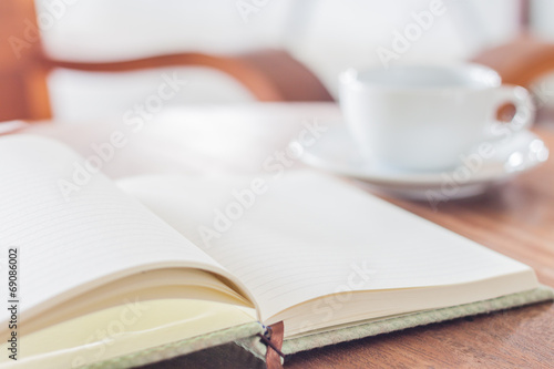 © punsayaporn, Naklejka premium Blank notebook with coffee cup