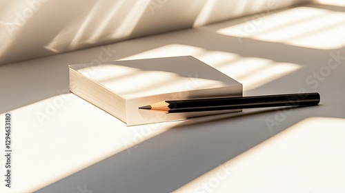 © qois, Fototapeta premium Blank notepad and pencil in sunlit room