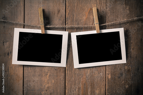 © pachaileknettip, Fototapeta premium Blank Old Photo Frame Hanging on a Rope By Clothespin on.Wood Ba